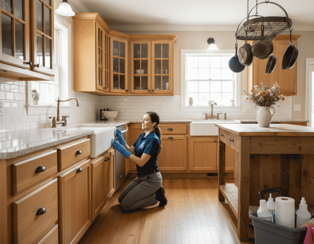 - Kitchen cleaning: countertops, sinks, stovetop, microwave exterior, appliance exteriors